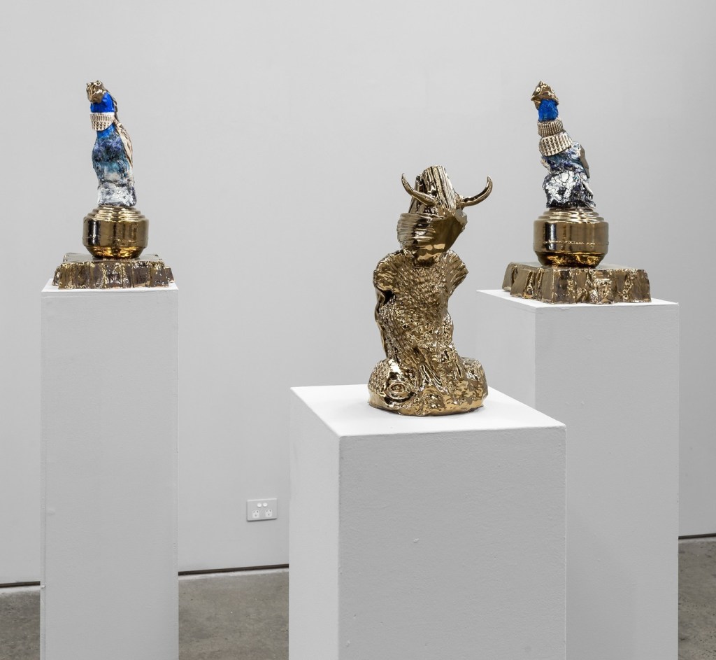 The setting for Ara Dolatian’s exhibition Heavenly Bodies does not do justice to his glittering, warped, ceramic idols. I don’t mind James Makin’s gallery, the polished concrete floors and anonymous art-gallery-white walls make sense to hang pastel toned, modernist domestica of Annalisa Ferraris, or to be dominated by the moody, storm-afflicted paintings of Paul Ryan, or the coarse, abstracted landscapes conjured out of blues and browns from Zoe Grey. But for Dolatian, I would prefer something more akin to the architectural drama of a cathedral, or at the very least a darkened room, tastefully painted black, perhaps with golden spotlights set to hit the works’ most mirrored edges — a ritual to desperately attempt invocation of the gods that sleep within those twisting vessels. To hell with white plinths.