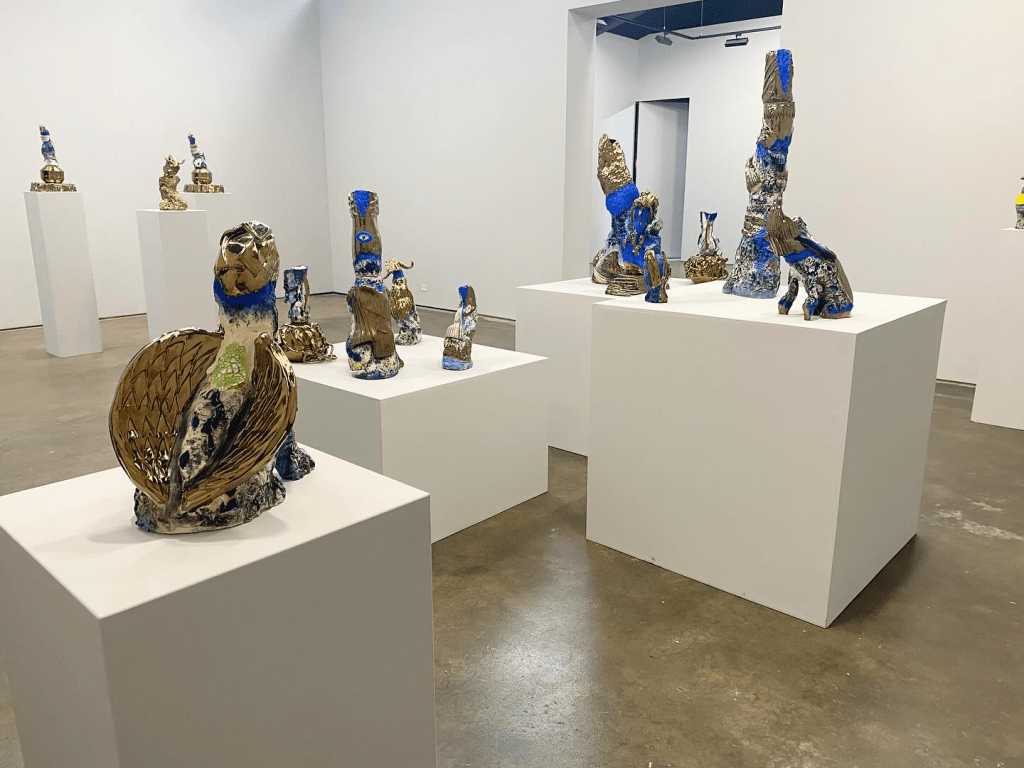 Dolatian is doing his part for the drama — his piece She She (2023), a mutant figure of pure glazed gold, adorned with horns and a subtle, foot-position eye, sits first and foremost in contrast to its fellow entities, those of which are blushed with lapis-lazuli blues to break up their own golden details. One could begin to tease out a hierarchy of material purity from amongst his works: the lesser gods, the melting amphori, and the omnipotent golden master. But what power is commanded through gold is undermined by the sheer textural complexity of the approximate sculptures, each work truly owning its domain in its own right.